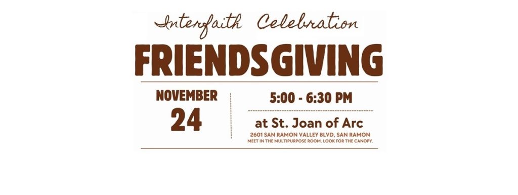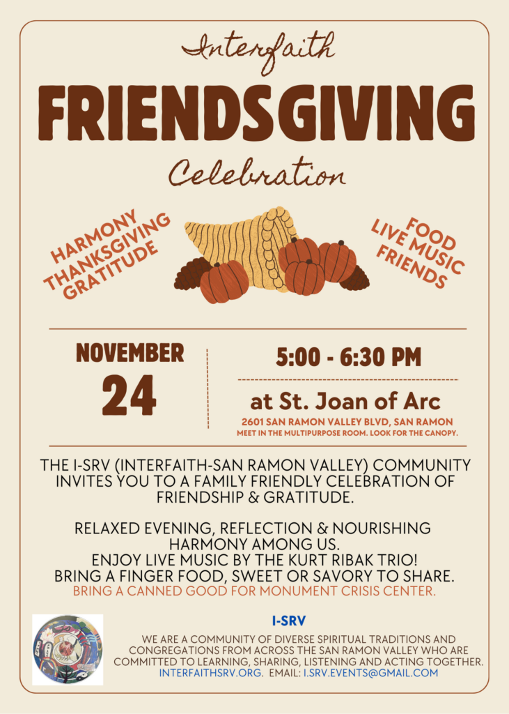 Even if bringing food doesn’t work for you, please join us for an evening of tending to friendship, gratitude, and harmony in our community from 5:00 to 6:30. We will gather in the Multipurpose Room at Saint Joan of Arc Parish in San Ramon. Look for the large canopy on the north side of the building. Address: 2601 San Ramon Valley.